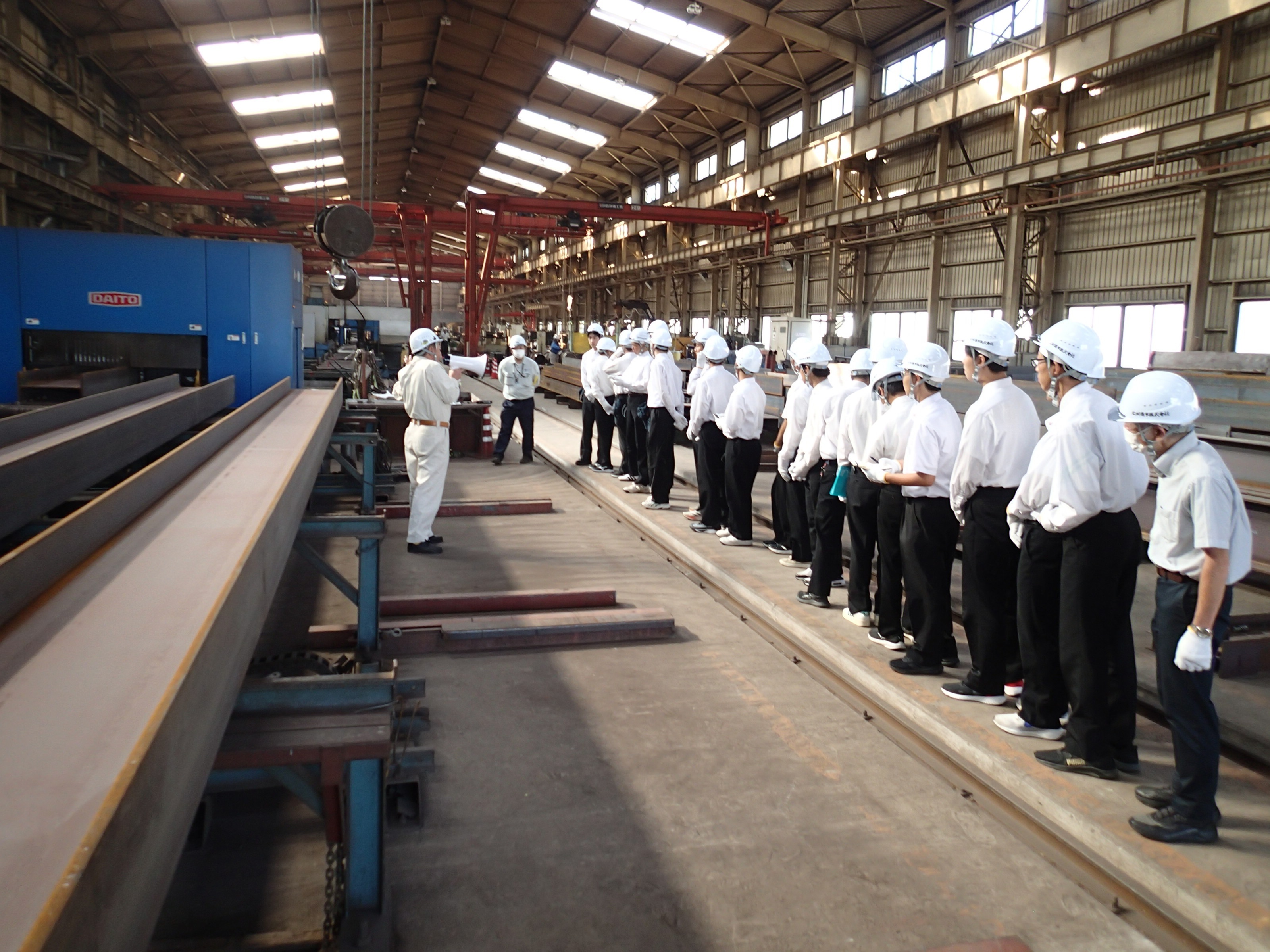 当日はメタルステーションの事業概要説明を行った後、2班に分かれて鋼板工場、橋梁・鉄骨工場を回り、
