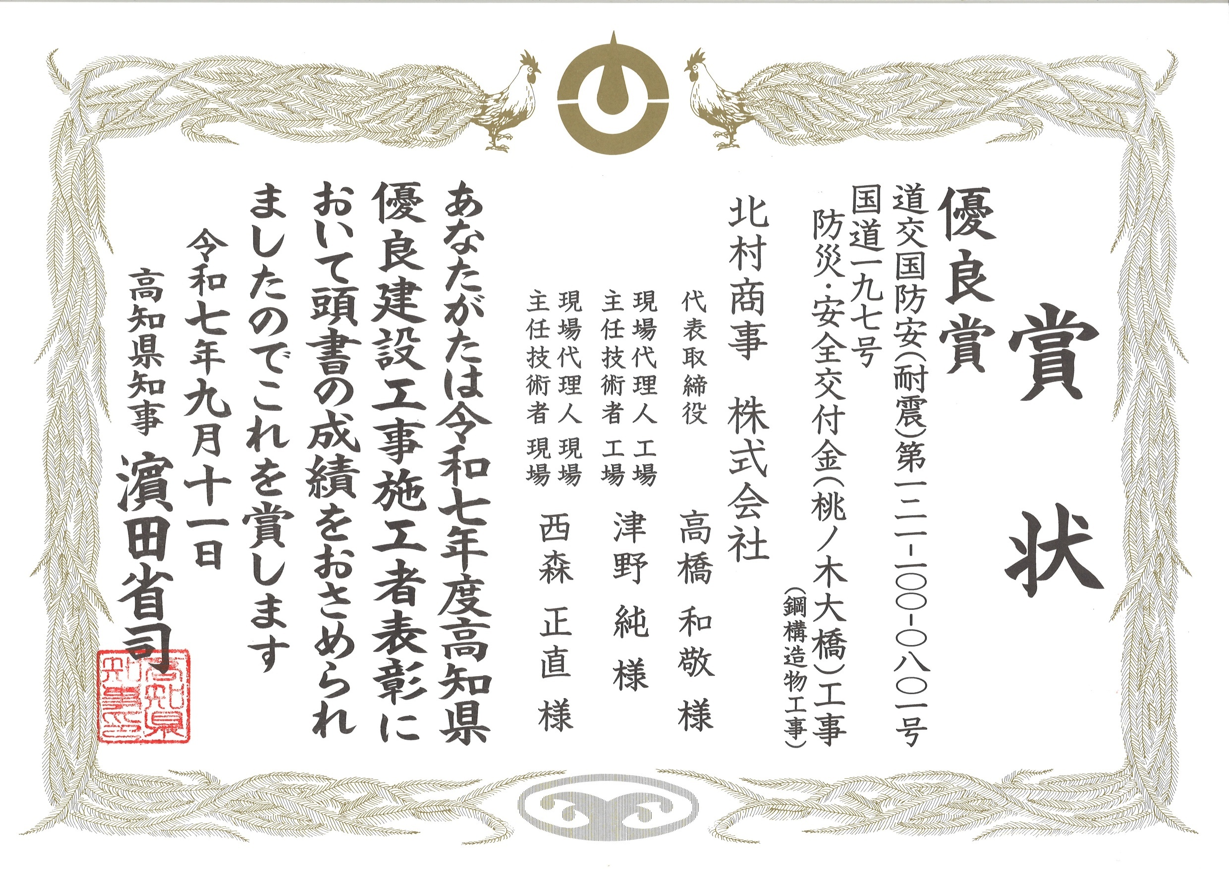 『国道197号防災・安全交付金(桃ノ木大橋)工事』 が高知県知事様より優良工事表彰を受賞しました。